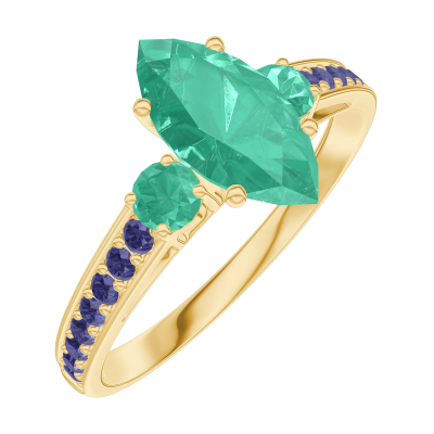 « L'ATELIER » Nº167194Bague Or jaune 9 carats - Émeraude Marquise 0.7 carat - Pierres de côté Émeraude - Sertissage Saphir bleu