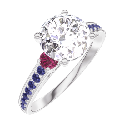 Bague Or blanc 9 carats - Diamant Rond 1 carat - Pierres de côté Rubis - Sertissage Saphir bleu