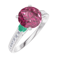 Bague Or blanc 18 carats - Rubis Rond 1 carat - Pierres de côté Émeraude - Sertissage Diamant