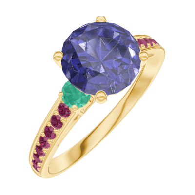 Bague Or jaune 18 carats - Saphir bleu Rond 1 carat - Pierres de côté Émeraude - Sertissage Rubis