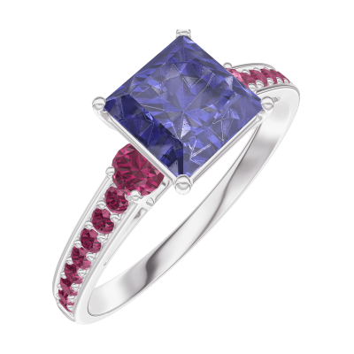 « L'ATELIER » Nº168551Bague Or blanc 18 carats - Saphir bleu Princesse 1 carat - Pierres de côté Rubis - Sertissage Rubis