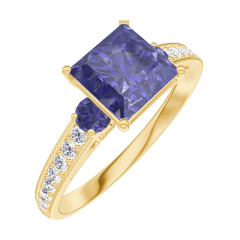 Bague Or jaune 18 carats - Saphir bleu Princesse 1 carat - Pierres de côté Saphir bleu - Sertissage Diamant