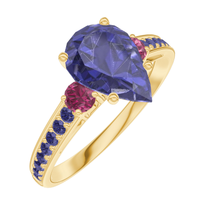« L'ATELIER » Nº 168853Bague Or jaune 18 carats - Saphir bleu Poire 1 carat - Pierres de côté Rubis - Sertissage Saphir bleu