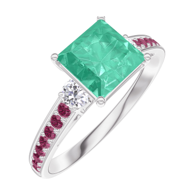« L'ATELIER » Nº169132Bague Or blanc 9 carats - Émeraude Princesse 1 carat - Pierres de côté Diamant - Sertissage Rubis