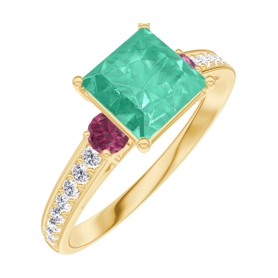 « L'ATELIER » Nº 169145Bague Or jaune 18 carats - Émeraude Princesse 1 carat - Pierres de côté Rubis - Sertissage Diamant