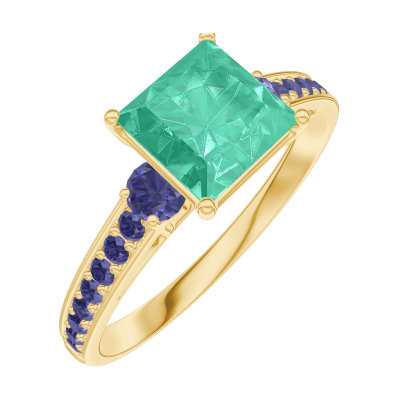 « L'ATELIER » Nº169174Bague Or jaune 9 carats - Émeraude Princesse 1 carat - Pierres de côté Saphir bleu - Sertissage Saphir bleu