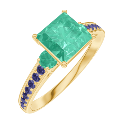 « L'ATELIER » Nº169194Bague Or jaune 9 carats - Émeraude Princesse 1 carat - Pierres de côté Émeraude - Sertissage Saphir bleu