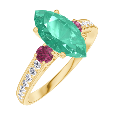 « L'ATELIER » Nº 169545Bague Or jaune 18 carats - Émeraude Marquise 1 carat - Pierres de côté Rubis - Sertissage Diamant