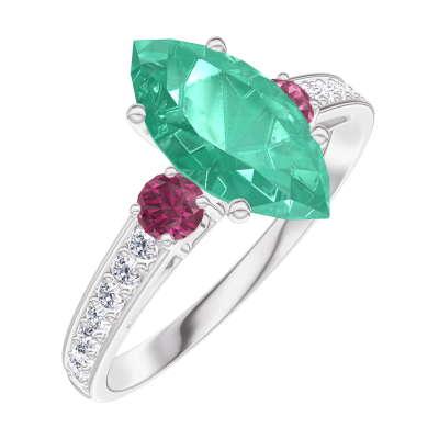« L'ATELIER » Nº 169547Bague Or blanc 18 carats - Émeraude Marquise 1 carat - Pierres de côté Rubis - Sertissage Diamant