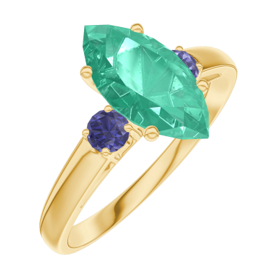 « L'ATELIER » Nº169562Bague Or jaune 9 carats - Émeraude Marquise 1 carat - Pierres de côté Saphir bleu