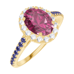 Bague Or jaune 9 carats - Rubis Ovale 0.5 carat - Halo Diamant - Sertissage Saphir bleu