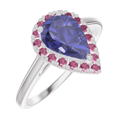 Bague Or blanc 9 carats - Saphir bleu Poire 0.5 carat - Halo Rubis