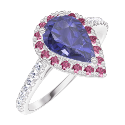 « L'ATELIER » Nº 170792Bague Or blanc 9 carats - Saphir bleu Poire 0.5 carat - Halo Rubis - Sertissage Diamant 4.8 (13)