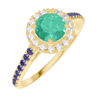 « L'ATELIER » Nº170878Bague Or jaune 9 carats - Émeraude Rond 0.5 carat - Halo Diamant - Sertissage Saphir bleu 4.7