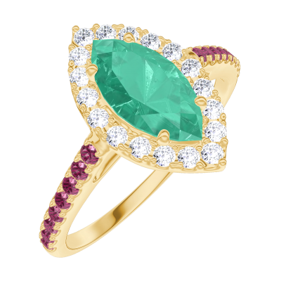 « L'ATELIER » Nº171113Bague Or jaune 18 carats - Émeraude Marquise 0.5 carat - Halo Diamant - Sertissage Rubis