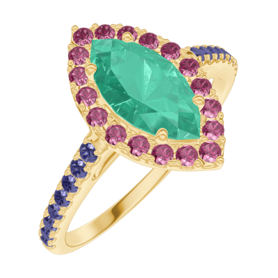 « L'ATELIER » Nº 171134Bague Or jaune 9 carats - Émeraude Marquise 0.5 carat - Halo Rubis - Sertissage Saphir bleu