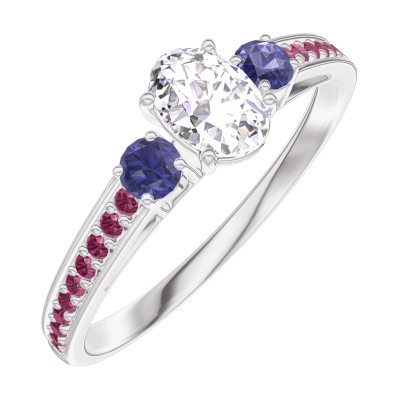 « L'ATELIER » Nº 180371Bague Or blanc 18 carats - Diamant synthétique Ovale 0.3 carat - Pierres de côté Saphir bleu - Sertissage Rubis 5