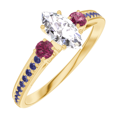 « L'ATELIER » Nº180554Bague Or jaune 9 carats - Diamant synthétique Marquise 0.3 carat - Pierres de côté Rubis - Sertissage Saphir bleu
