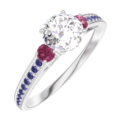 « L'ATELIER » Nº 182456Bague Or blanc 9 carats - Diamant synthétique Rond 0.5 carat - Pierres de côté Rubis - Sertissage Saphir bleu 4.5