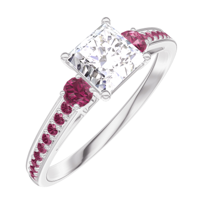 « L'ATELIER » Nº182552Bague Or blanc 9 carats - Diamant synthétique Princesse 0.5 carat - Pierres de côté Rubis - Sertissage Rubis