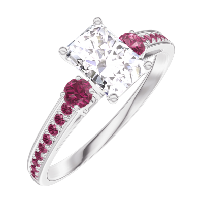 Bague Or blanc 18 carats - Diamant synthétique Rectangle 0.5 carat - Pierres de côté Rubis - Sertissage Rubis