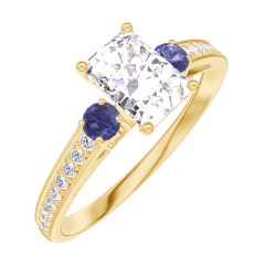 Pourquoi nous faire confiance ? « L'ATELIER » Nº 182666 Bague Or jaune 9 carats - Diamant synthétique Rectangle 0.5 carat - Pierres de côté Saphir bleu - Sertissage Diamant synthétique