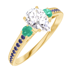 « L'ATELIER » Nº 182893Bague Or jaune 18 carats - Diamant synthétique Poire 0.5 carat - Pierres de côté Émeraude - Sertissage Saphir bleu