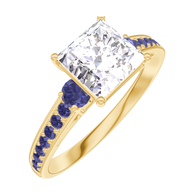 « L'ATELIER » Nº187373Bague Or jaune 18 carats - Diamant synthétique Princesse 1 carat - Pierres de côté Saphir bleu - Sertissage Saphir bleu