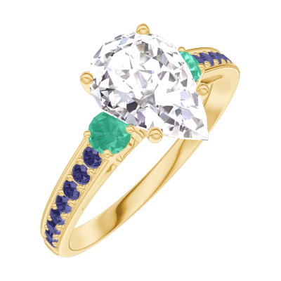 « L'ATELIER » Nº187694Bague Or jaune 9 carats - Diamant synthétique Poire 1 carat - Pierres de côté Émeraude - Sertissage Saphir bleu