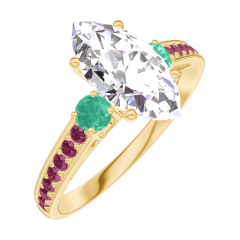 Pourquoi nous faire confiance ? « L'ATELIER » Nº 187789 Bague Or jaune 18 carats - Diamant synthétique Marquise 1 carat - Pierres de côté Émeraude - Sertissage Rubis