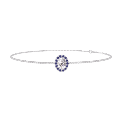 « L'ATELIER » Nº200128Bracelet Or blanc 9 carats - Diamant Ovale 0.3 carat - Halo Saphir bleu - Chaîne Vénitienne