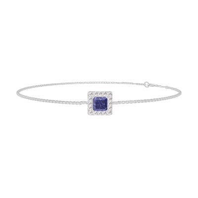 « L'ATELIER » Nº 200624Bracelet Or blanc 9 carats - Saphir bleu Princesse 0.3 carat - Halo Diamant - Chaîne Vénitienne