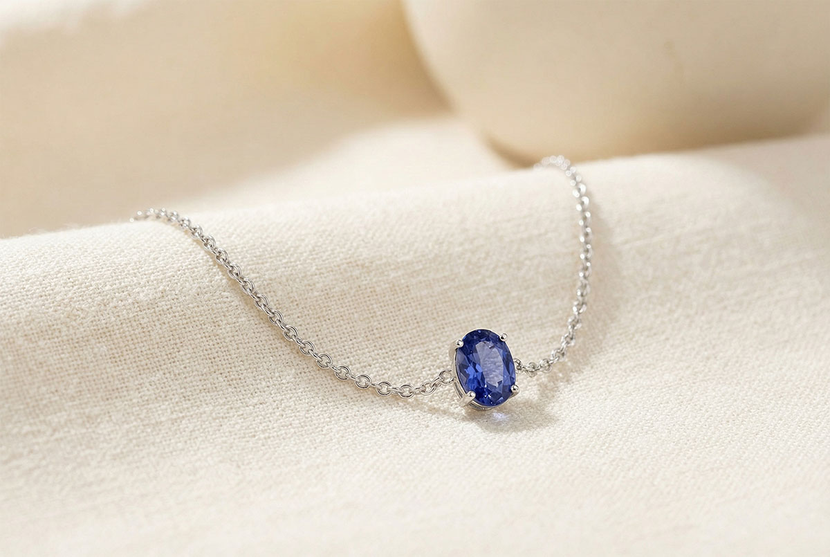 « L'ATELIER » Nº 200676Bracelet Or blanc 9 carats - Saphir bleu Ovale 0.3 carat - Chaîne Forçat