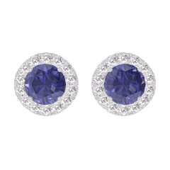 Boucles d'oreilles Or blanc 9 carats - Saphir bleu Rond 0.3 carat (2 X) - Halo Diamant
