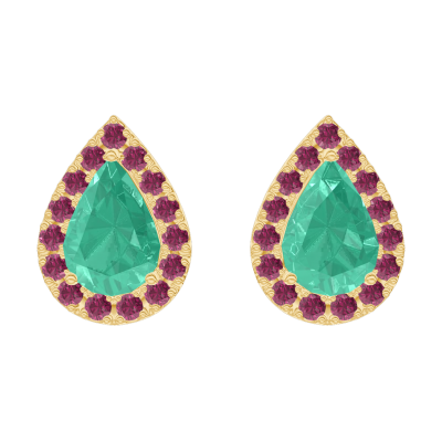 « L'ATELIER » Nº201417Boucles d'oreilles Or jaune 18 carats - Émeraude Poire 0.3 carat (2 X) - Halo Rubis