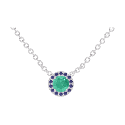 « L'ATELIER » Nº202235Collier Or blanc 18 carats - Émeraude Rond 0.3 carat - Halo Saphir bleu - Chaîne Forçat