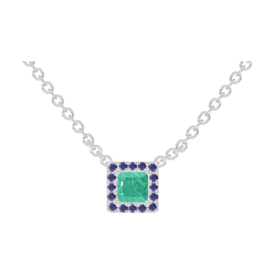 « L'ATELIER » Nº202268Collier Or blanc 9 carats - Émeraude Princesse 0.3 carat - Halo Saphir bleu - Chaîne Forçat