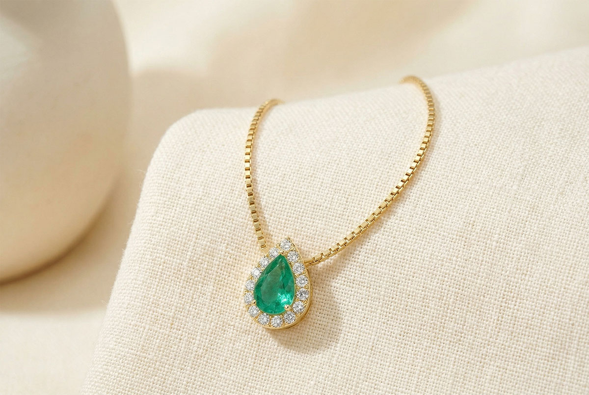 « L'ATELIER » Nº 202349Collier Or jaune 18 carats - Émeraude Poire 0.3 carat - Halo Diamant - Chaîne Vénitienne