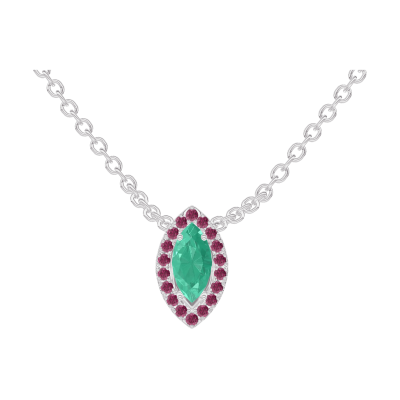 « L'ATELIER » Nº202388Collier Or blanc 9 carats - Émeraude Marquise 0.3 carat - Halo Rubis - Chaîne Forçat