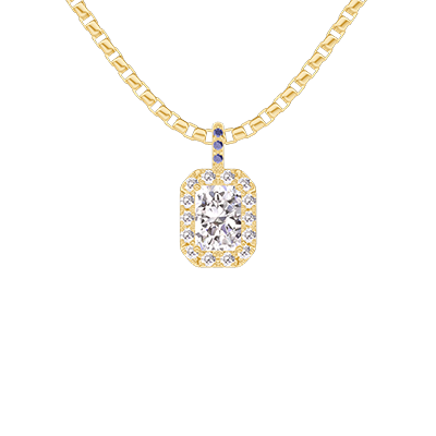 « L'ATELIER » Nº204030Pendentif Or jaune 9 carats - Diamant synthétique Rectangle 0.3 carat - Halo Diamant synthétique - Sertissage Saphir bleu - Chaîne Vénitienne
