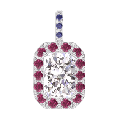 « L'ATELIER » Nº204048Pendentif Or blanc 9 carats - Diamant synthétique Rectangle 0.3 carat - Halo Rubis - Sertissage Saphir bleu - Pas de chaîne