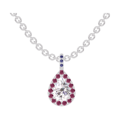 « L'ATELIER » Nº204448Pendentif Or blanc 9 carats - Diamant synthétique Poire 0.3 carat - Halo Rubis - Sertissage Saphir bleu - Chaîne Forçat