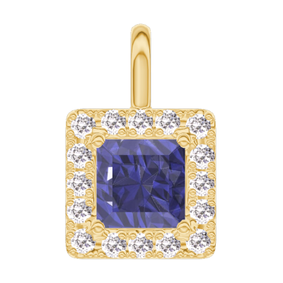 « L'ATELIER » Nº206098Pendentif Or jaune 9 carats - Saphir bleu Princesse 0.3 carat - Halo Diamant - Pas de chaîne