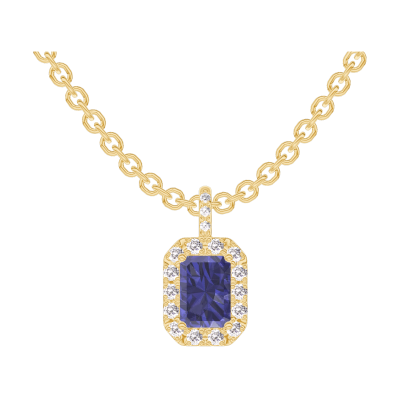 « L'ATELIER » Nº206310Pendentif Or jaune 9 carats - Saphir bleu Rectangle 0.3 carat - Halo Diamant - Sertissage Diamant - Chaîne Forçat