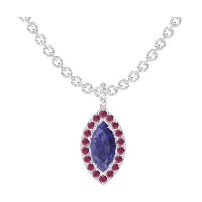 « L'ATELIER » Nº 206935Pendentif Or blanc 18 carats - Saphir bleu Marquise 0.3 carat - Halo Rubis - Sertissage Diamant - Chaîne Forçat