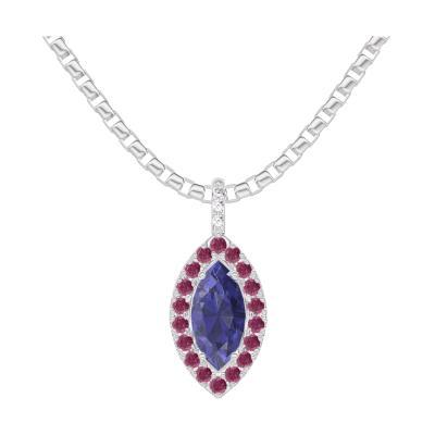 « L'ATELIER » Nº206952Pendentif Or blanc 9 carats - Saphir bleu Marquise 0.3 carat - Halo Rubis - Sertissage Diamant - Chaîne Vénitienne