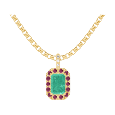 « L'ATELIER » Nº207525Pendentif Or jaune 18 carats - Émeraude Rectangle 0.3 carat - Halo Rubis - Sertissage Diamant - Chaîne Vénitienne