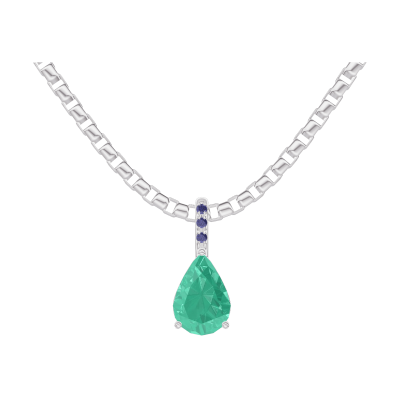 Pendentif Or blanc 18 carats - Émeraude Poire 0.3 carat - Sertissage Saphir bleu - Chaîne Vénitienne