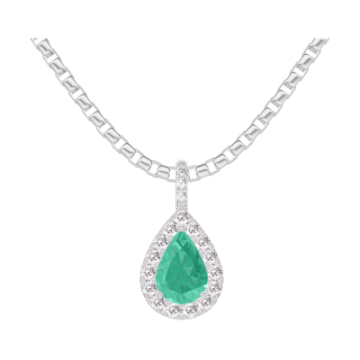 « L'ATELIER » Nº207864Pendentif Or blanc 9 carats - Émeraude Poire 0.3 carat - Halo Diamant - Sertissage Diamant - Chaîne Vénitienne