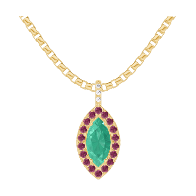« L'ATELIER » Nº208102Pendentif Or jaune 9 carats - Émeraude Marquise 0.3 carat - Halo Rubis - Sertissage Diamant - Chaîne Vénitienne